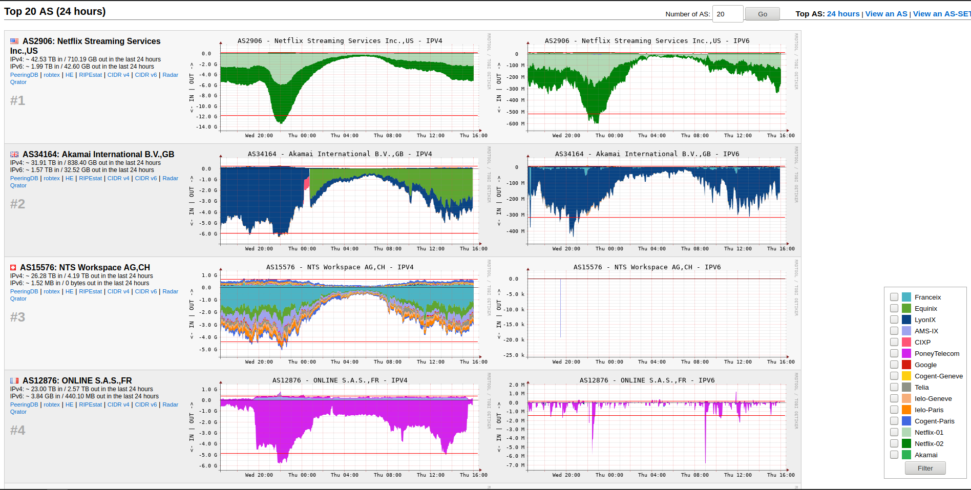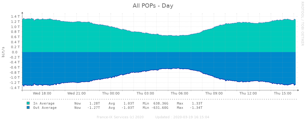 - Bon, j’entends des rumeurs comme quoi Internet est cassé, que Orange va tout couper … J’ai pas écouté ces rumeurs et à la place je suis allé voir les statistiques. Comme expliqué dans le Jour 1 , le réseau à l’air de relativement bien aller (même si certains services sont saturés, mais c’est un autre problème). Ci dessous, les statistiques globales de Franceix. On voit qu’il n’y a pas de changement notable sur un mois ou sur une semaine.