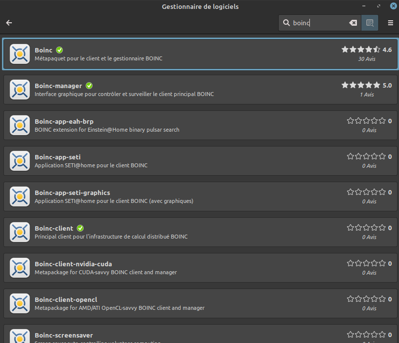 Sur ma distribution (Linux Mint) , BOINC est disponible dans le gestionnaire de logiciels. Sinon vous pouvez également utiliser l’installeur disponnible sur la page de téléchargement (d’après le site, BOINC est testé sur la dernière version d’Ubuntu.) Pour les autres distributions plus d’informations ici (en anglais).