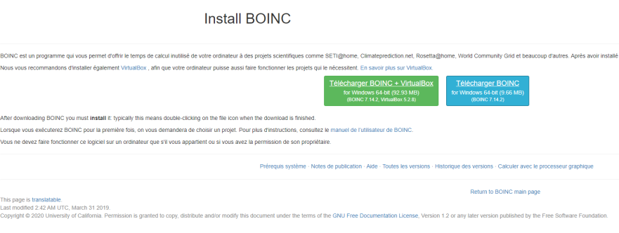 On vous proposera d’installer BOINC ou BOINC + VirtualBox pour faire tourner BOINC dans une machine virtuel. C’est un peu plus compliqué à mettre en place, on va rester sur la solution de facilité : BOINC uniquement.
