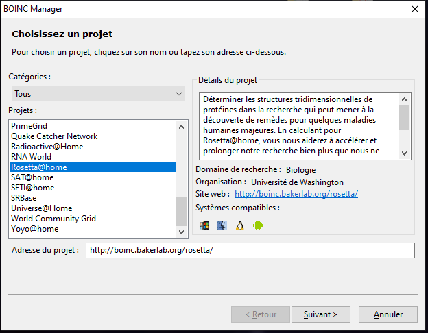 Ici nous allons choisir Rosetta@home mais libre à vous de participer à d’autres projets.