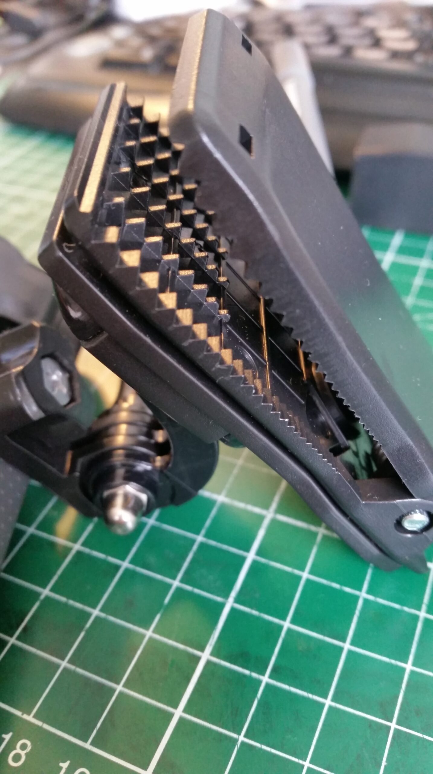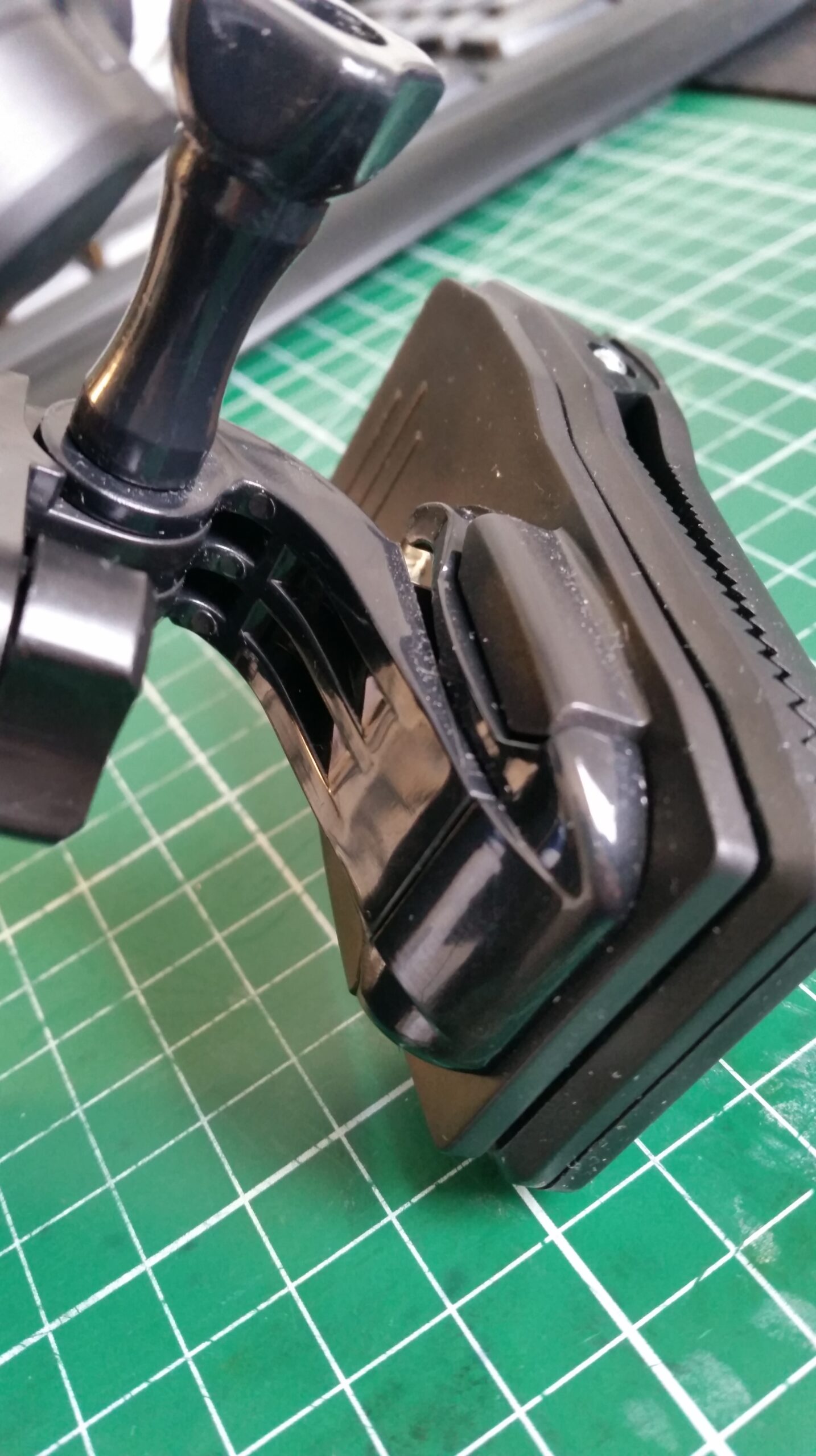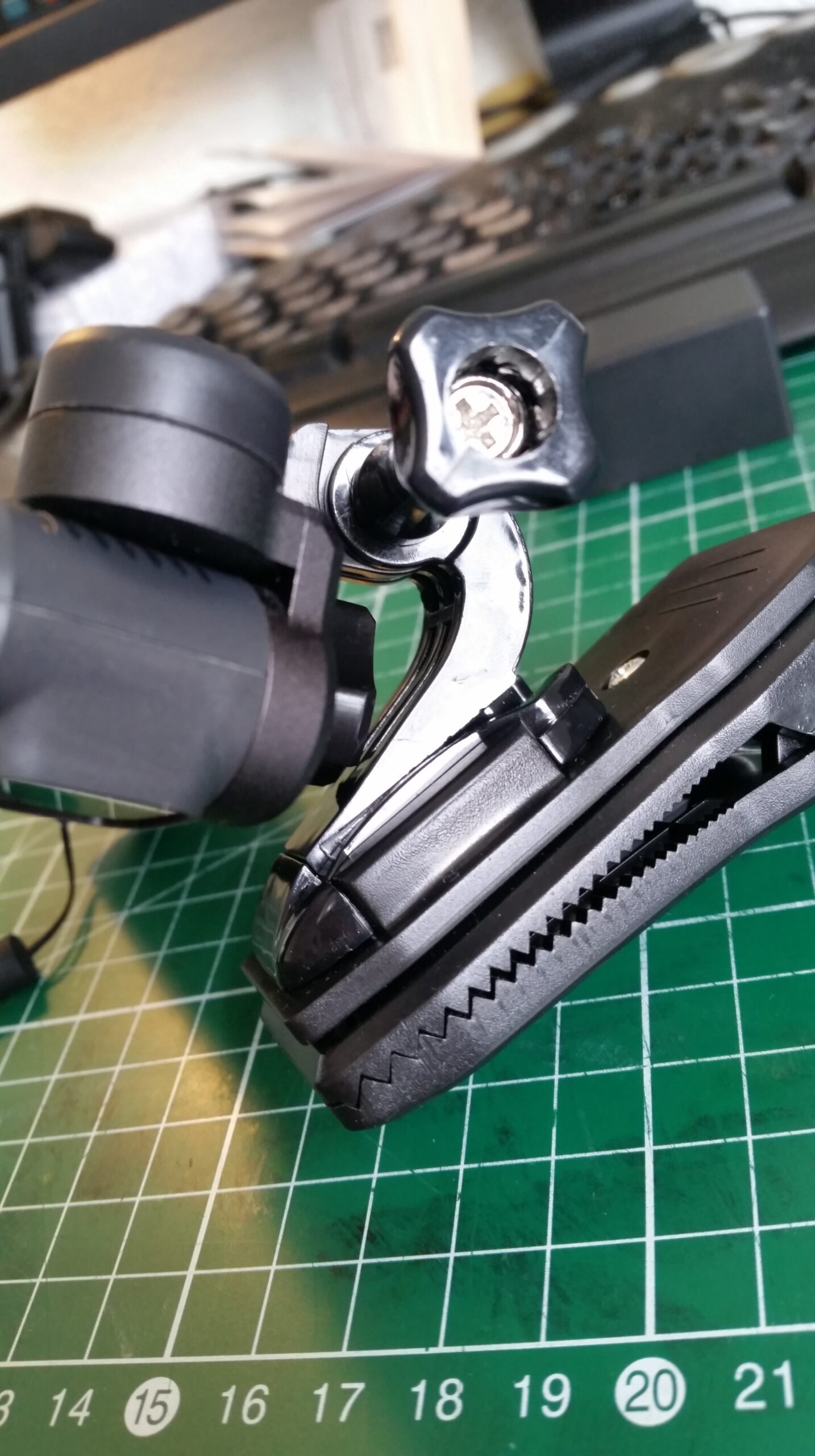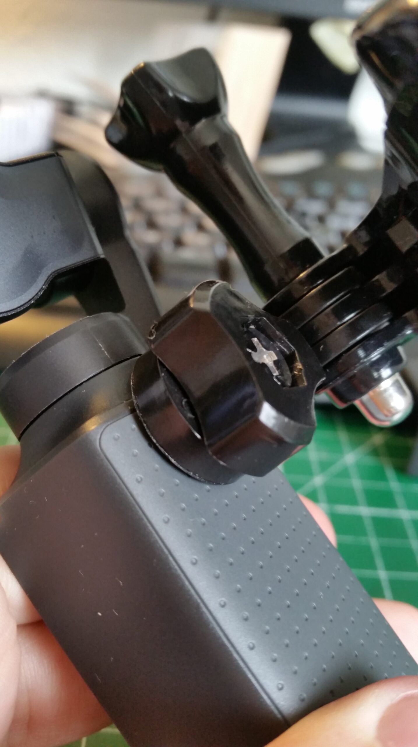 Enfin, et c’est à préciser : il y a du jeu dans tout cet attirail. Si bien qu’a chaque pas on entend des cliquetis et c’est très désagréable quand on visionne la vidéo après coup. Je suis venu caler l’ensemble avec une petite feuille de plastique … Ca fait le taf mais c’est chiant de devoir tout faire sois même …