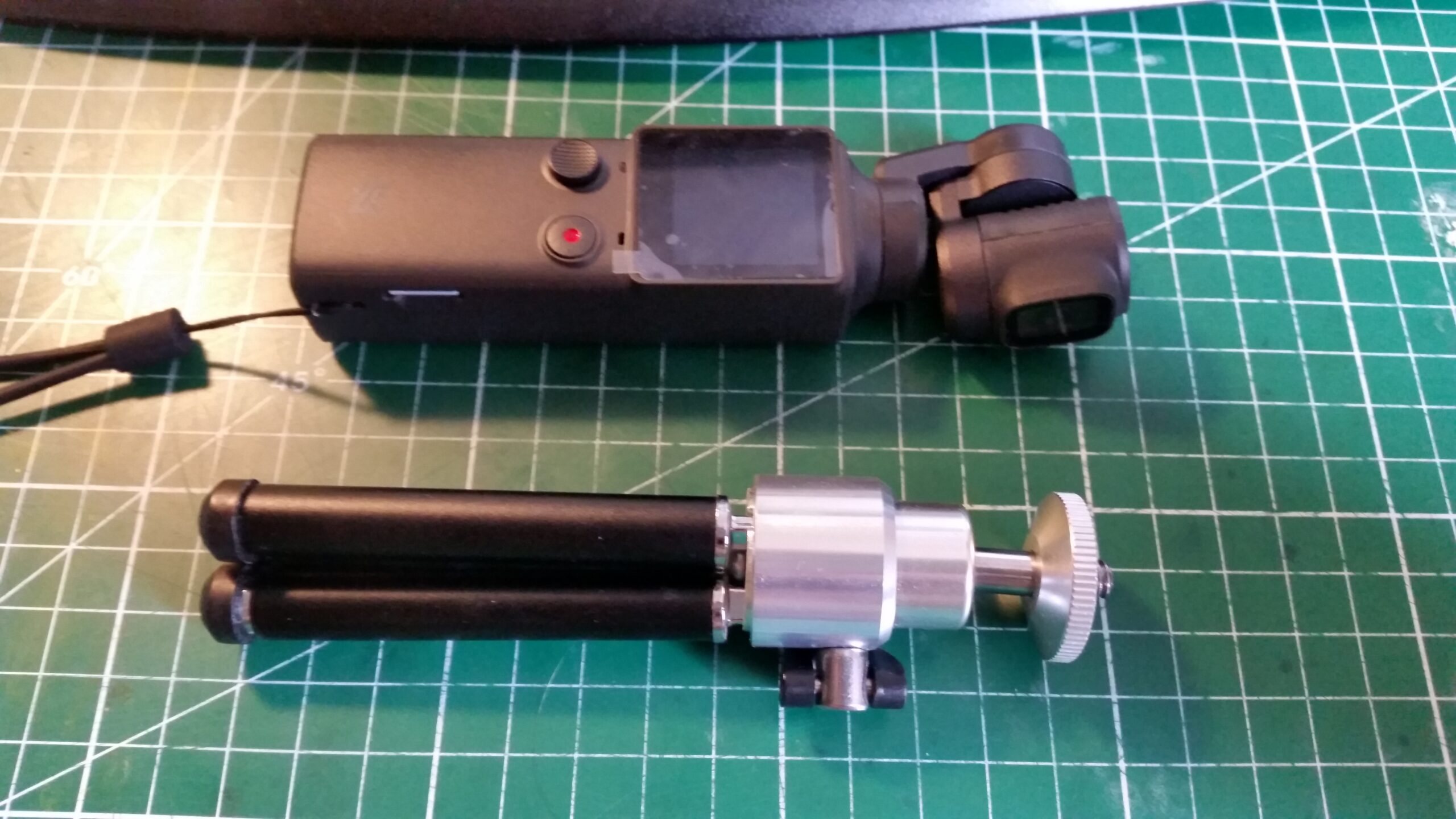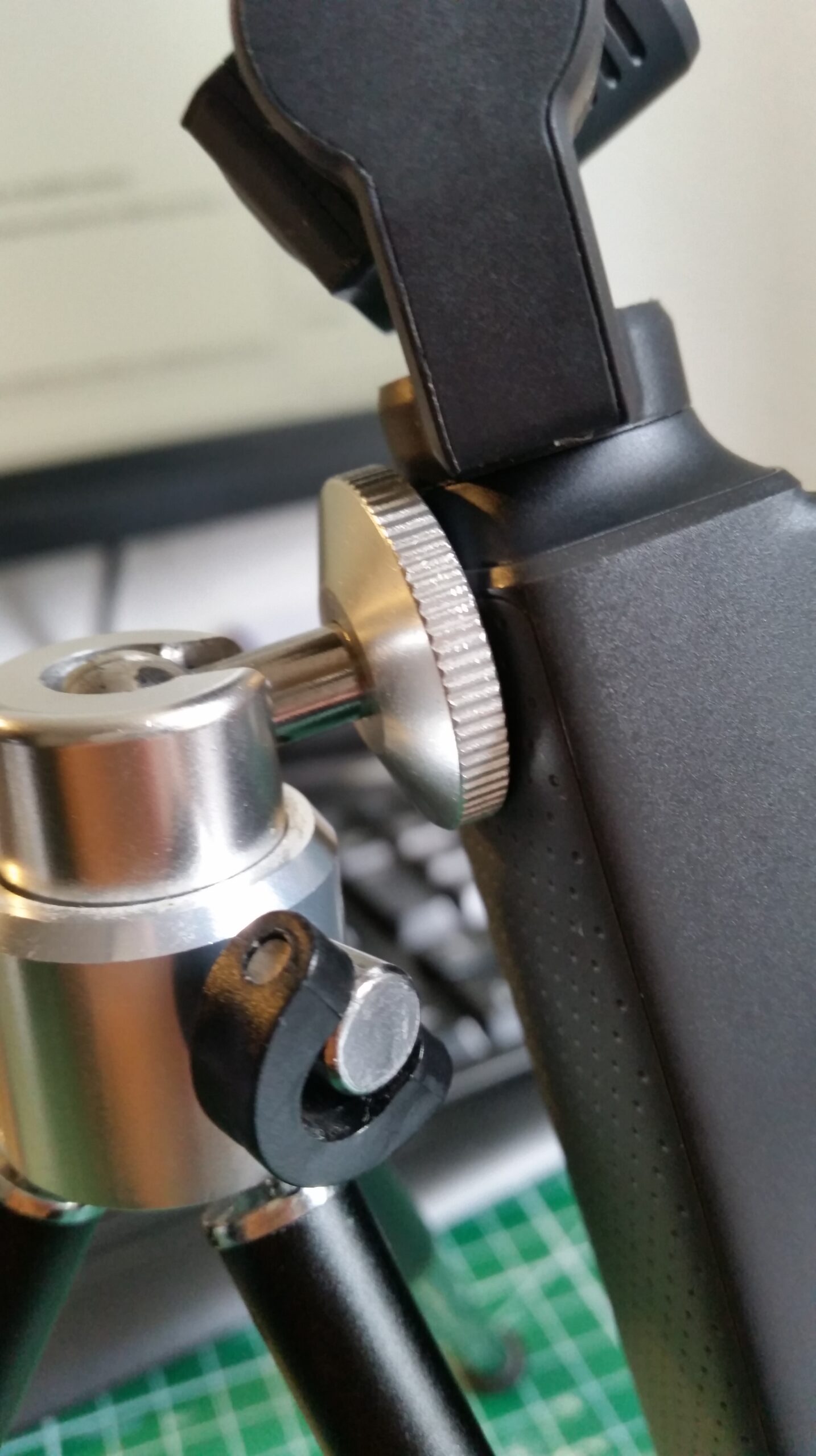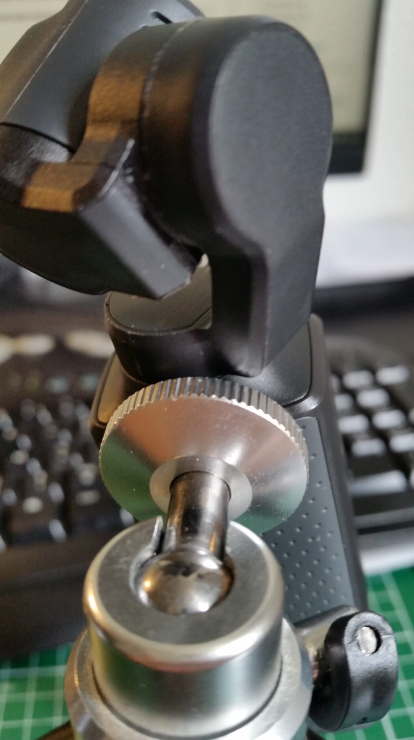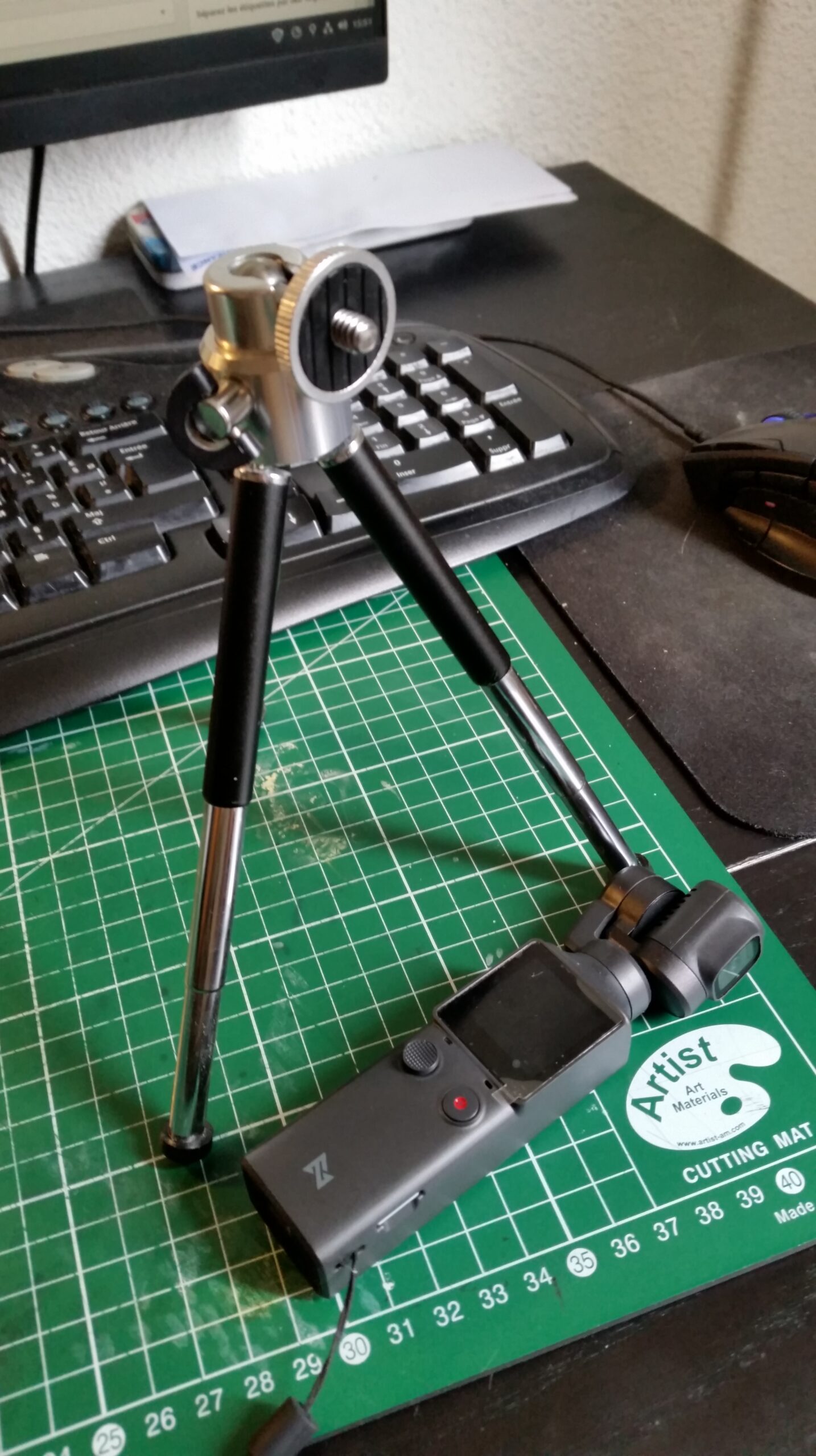 Mais je me suis rappelé que j’avais un mini trépied. Celui qui était fournit avec ma webcam ! (pour info Logitech HD 1080 p (que je ne vous recommande pas non plus j’en ai déjà cassé deux…) Le petit trépied est relativement de bonne facture et transpire une certaine solidité avec ces nombreux éléments en métal. Je ne sais pas si on se rend bien compte sur les photos, mais le problème c’est que vu la disposition du filetage sur la caméra, le gimbal viendrait cogner sur la platine du trépied. Or empêcher le mouvement d’un des moteurs du gimbal : c’est très mauvais ! Ce sont des machins fragiles ! Donc on fera attention quand on l’utilisera et on lui fera pas faire 360° no scope.